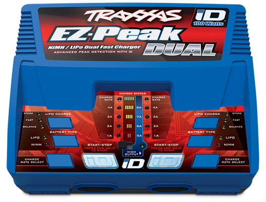 Simple. Fast. Just plug in a pair of Traxxas iD batteries and press Start. Traxxas’ exclusive iD technology eliminates complicated charger programming by automatically configuring and optimizing the charge settings for Traxxas iD batteries. The EZ-Peak Dual charges two batteries simultaneously at up to 50 watts (4-amps) each, or switch to High-Output mode to charge a single battery at the maximum 100 watt (8-amps) output. Charging faster means more fun time behind the wheel. You can even charge a NiMH and a LiPo at the same time! The progress bar and audible alerts keep you informed while the advanced high resolution peak detection delivers a perfect charge every time. The EZ-Peak Dual’s Storage Mode protects your LiPo battery investment by safely preparing the batteries for extended storage.