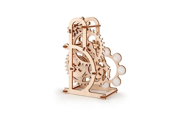 The Dynamometer is one of the simplest UGEARS models but at the same time it demonstrates several basic principles of mechanics, including the cascade of gears and the mechanical junction known as the Geneva drive.
